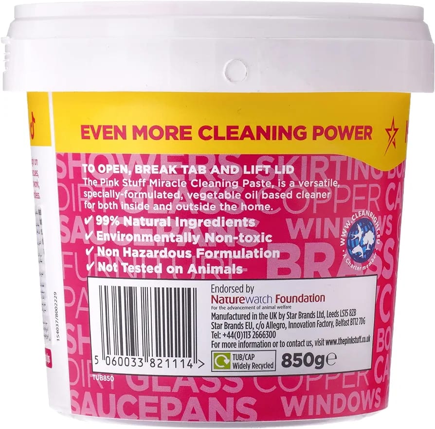 The Pink Stuff Miracle Cleaning Paste is perfect for cleaning dirt, grime and stains on saucepans, cooker tops, sinks, uPVC, barbecues, ceramic tiles, glass, showers, garden furniture, paintwork, boats and brass... the list is endless.